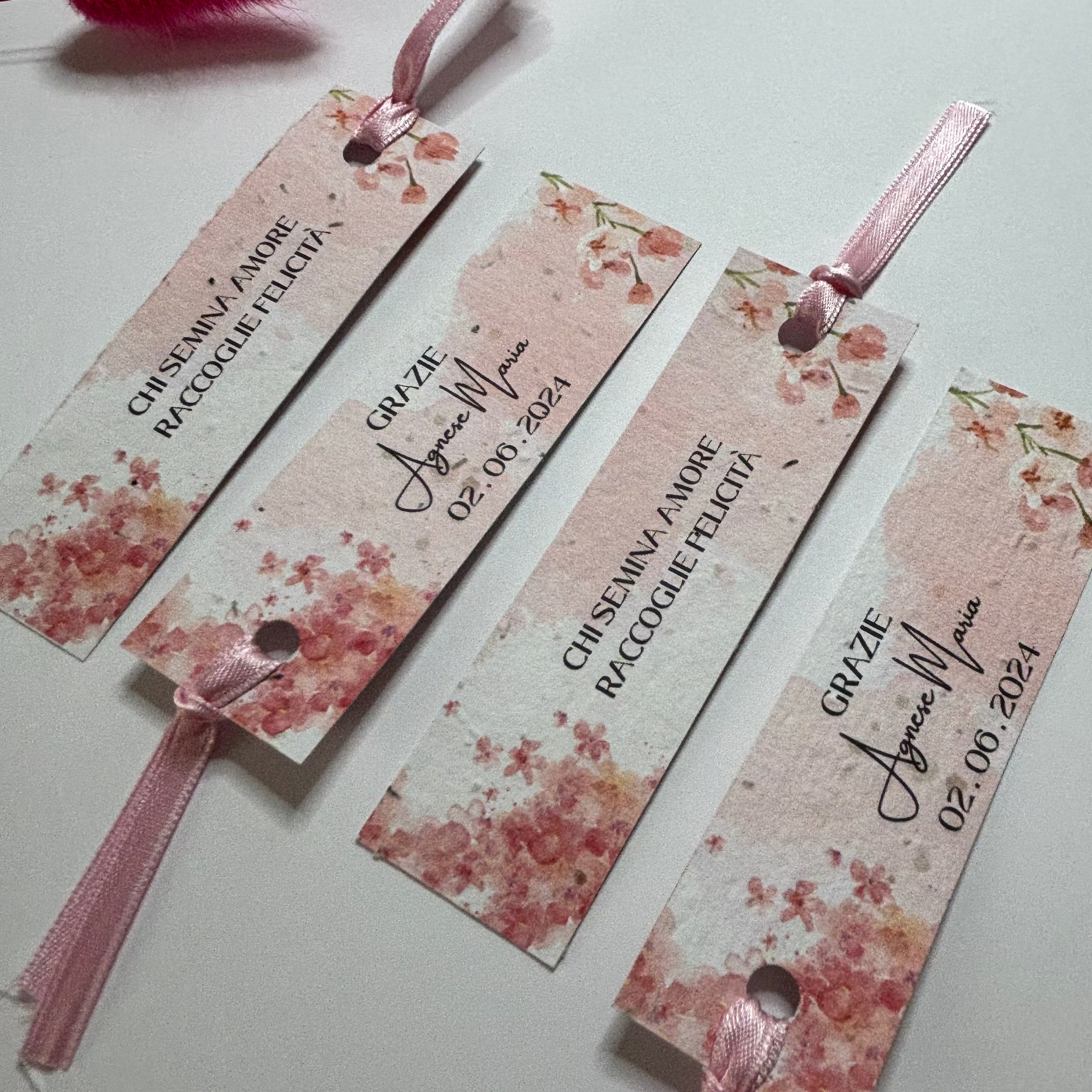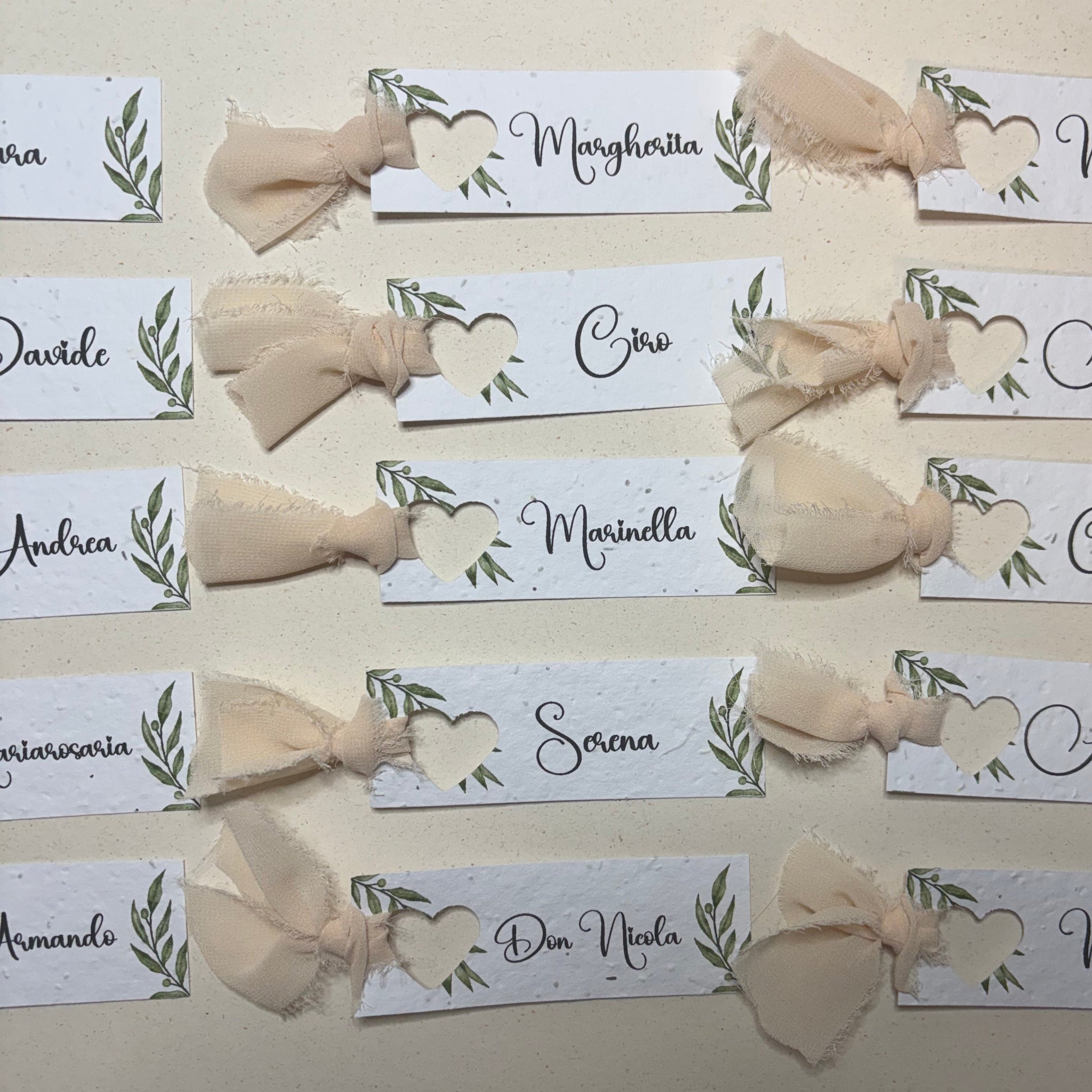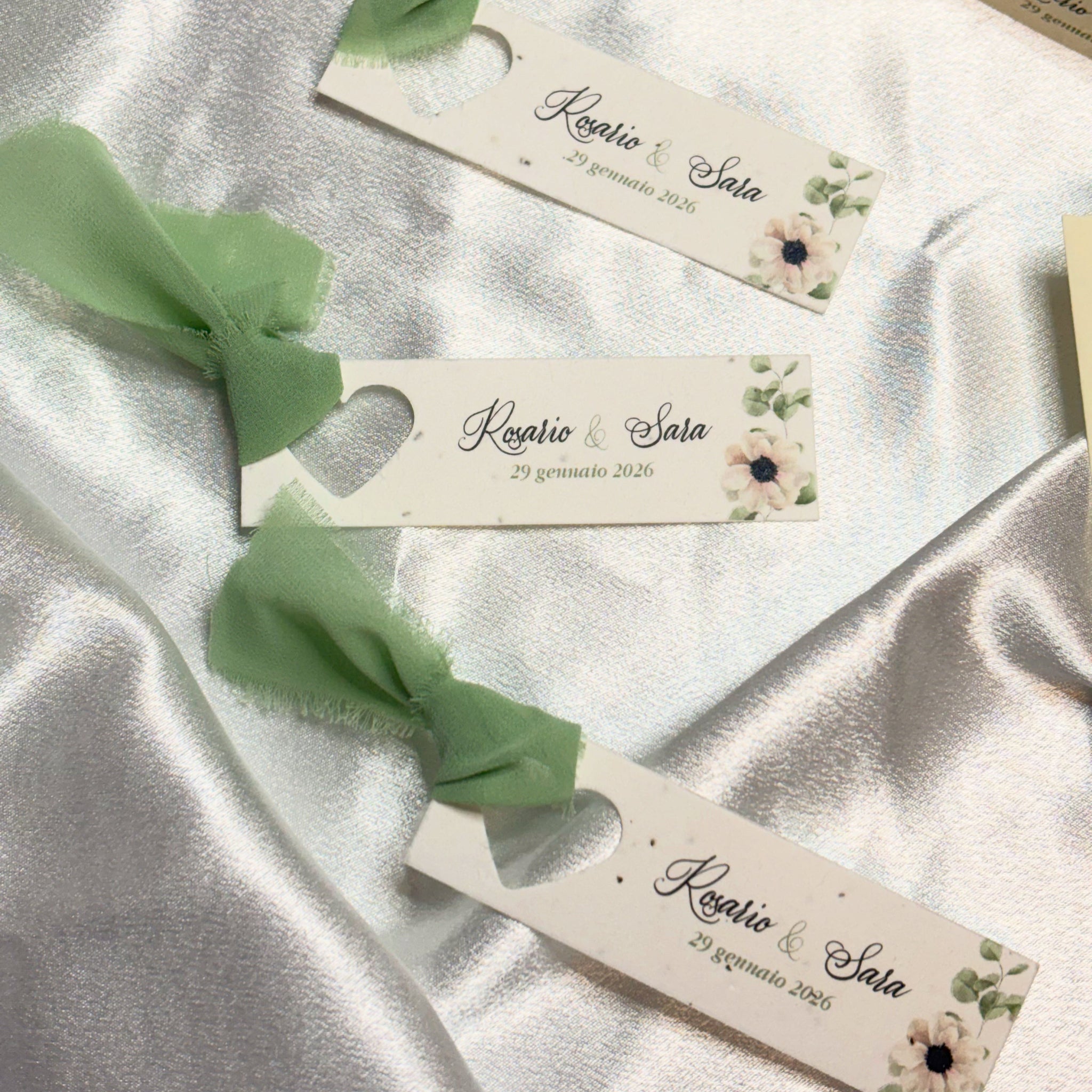 Segnaposto stretto con foro a forma di cuore, composto con cartoncino piantabile oppure in cartoncino ecologico. Personalizzabile con diverse tipologie di nastrini: juta classica, raso o garzato oppure con elegantissimo chiffon.